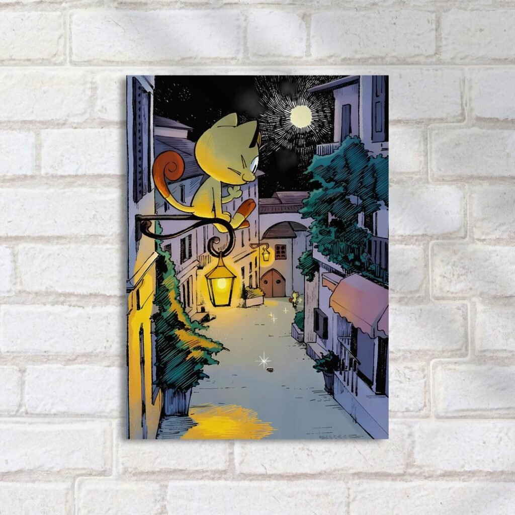 Quadro Decorativo Gato Lampada Noite Cidade