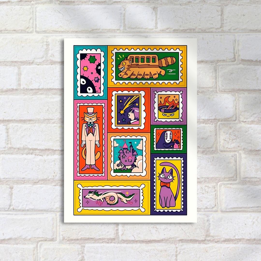 Quadro Decorativo Gatos Selo Colorido Studio Ghibli