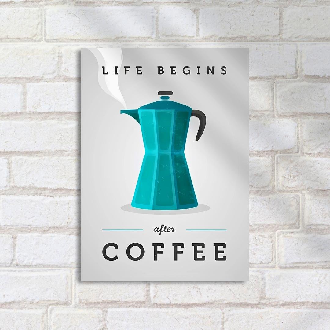 Quadro Decorativo Cafeteira Azul Frase Cafe