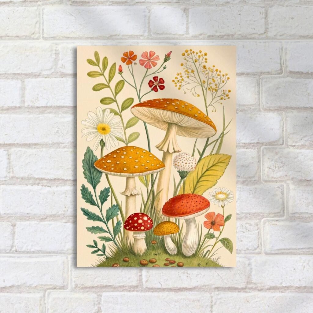 Quadro Decorativo Cogumelos Flores Ilustracao