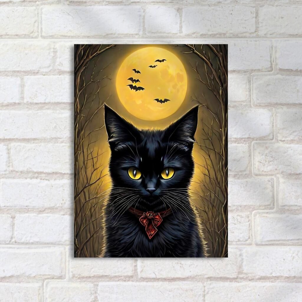 Quadro Decorativo Gato Preto Lua Morcegos