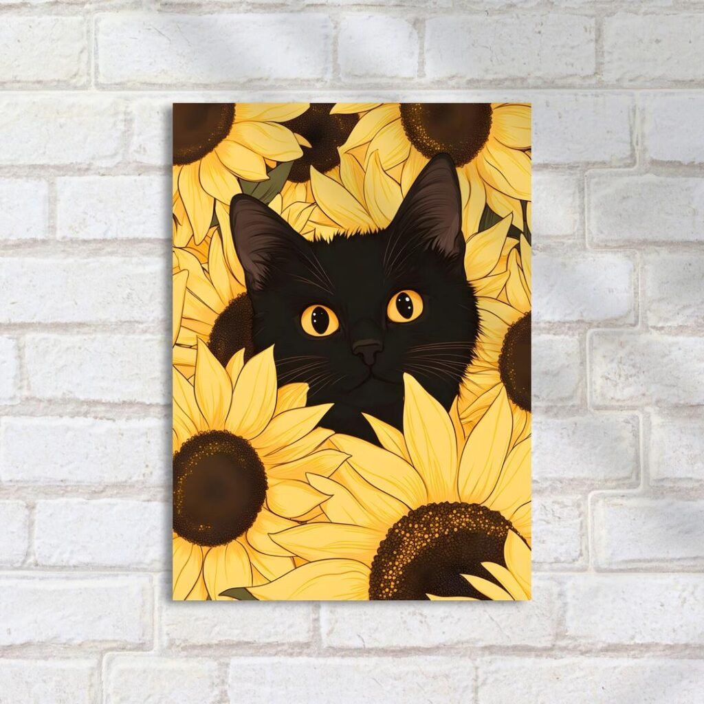 Quadro Decorativo Gato Preto Girassois