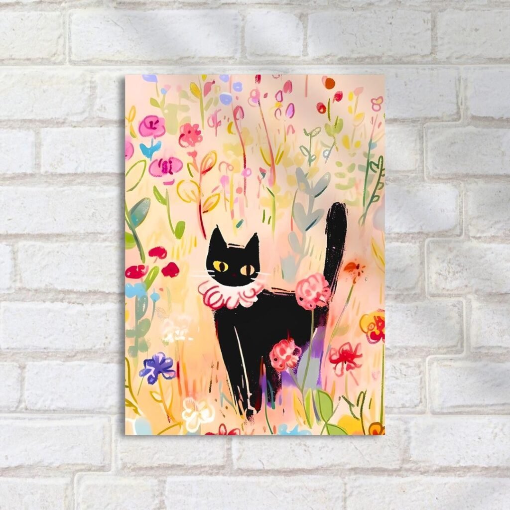 Quadro Decorativo Gato Preto Campo Flores