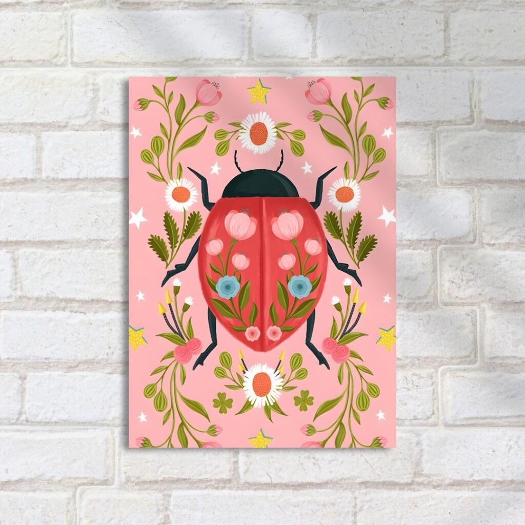Quadro Decorativo Joaninha Flores Fundo Rosa