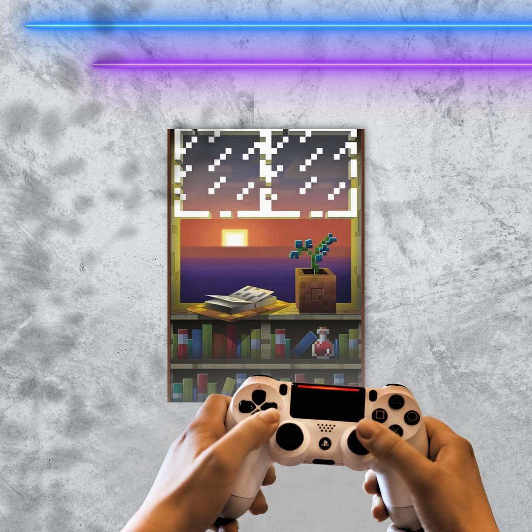 Quadro Decorativo Minecraft Jardim Biblioteca Por Do Sol
