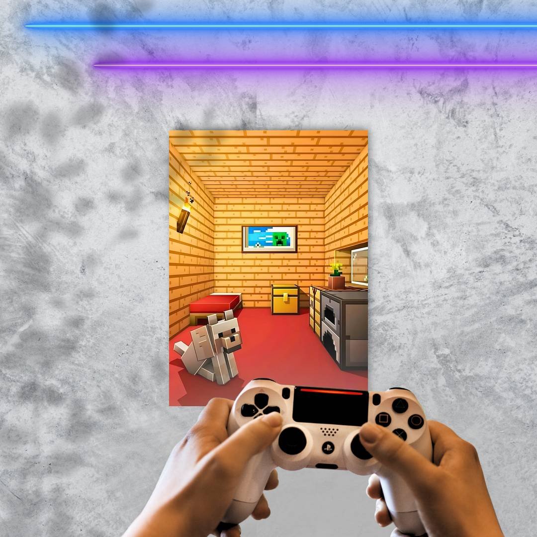 Quadro Decorativo Minecraft Quarto Cachorro Fogueira