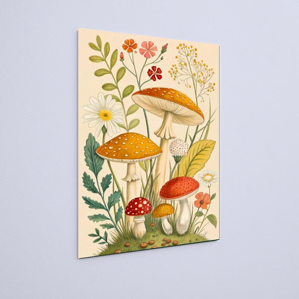 Quadro Decorativo Cogumelos Flores Ilustracao