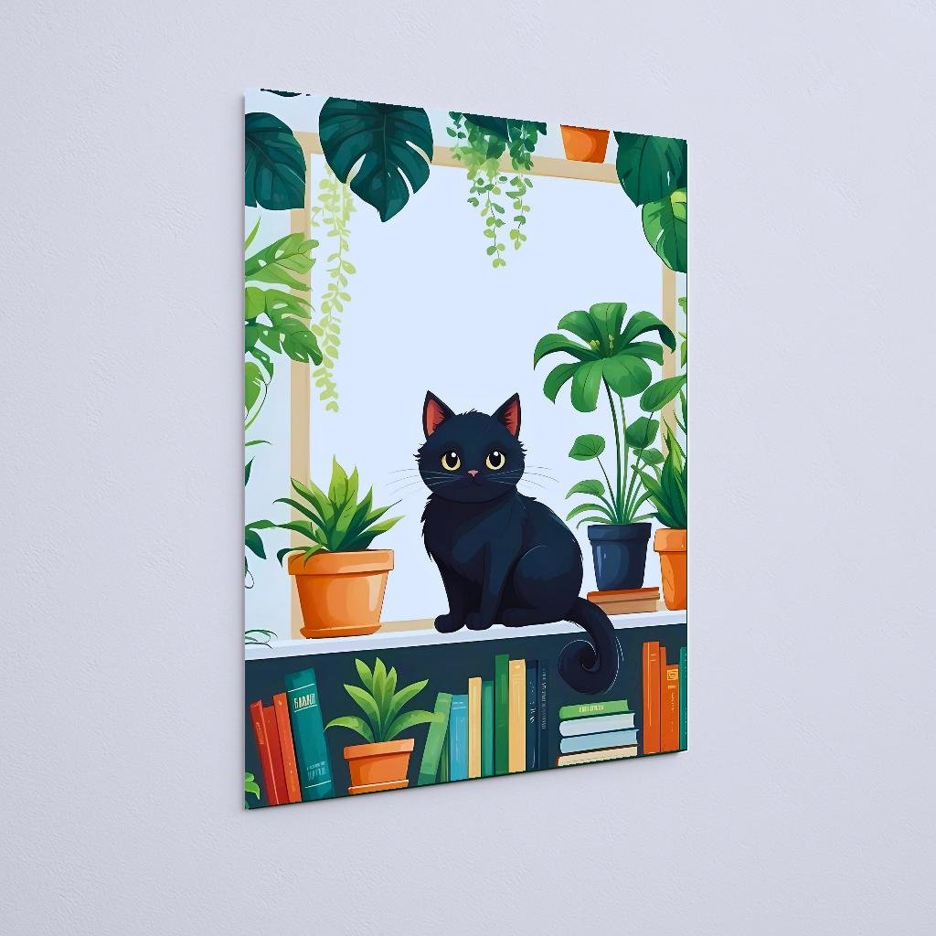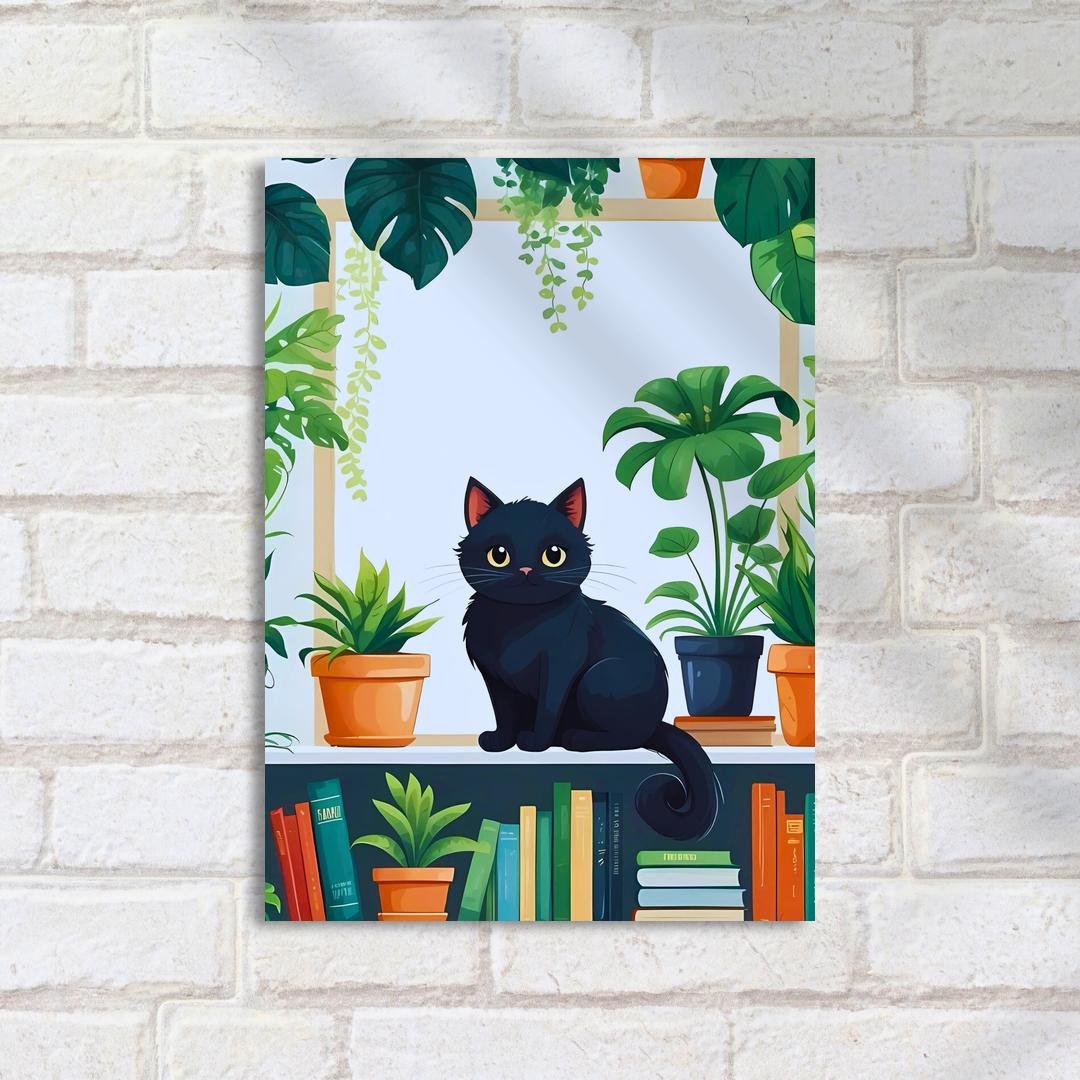 Quadro Decorativo Gato Preto Plantas Livros